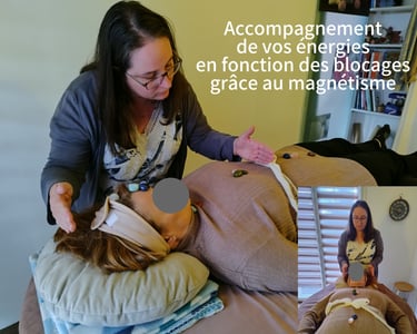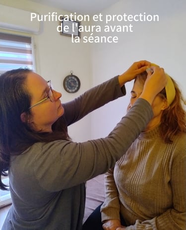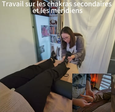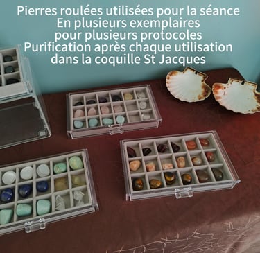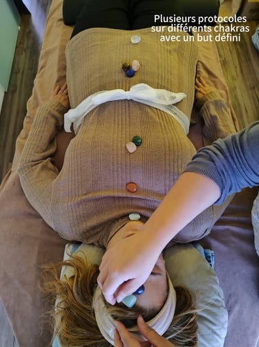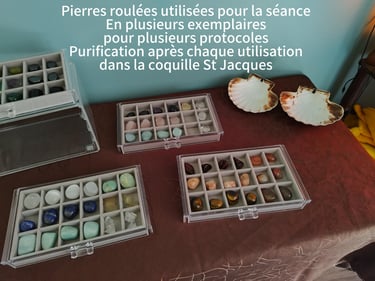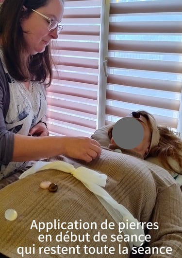 Ensuite, la séance se fait allongée, dans une ambiance détente, et je commence par un nettoyage énergétique, suivi d'un renforcement aurique, puis d'un travail sur la circulation énergétique et d'un équilibrage de tous vos corps énergétiques. En fonction de vos besoins, j'établis un protocole personnalisé pour y répondre, défini à l'aide de vos réponses et une évaluation selon les 5 éléments de la médecine chinoise. Je peux appliquer les pierres ayant une affinité avec le méridien correspondant à votre déséquilibre. Puis je termine par une harmonisation de tous les chakras. Si vous n'avez pas de besoin, je ne fais pas le protocole personnalisé et j'harmonise les chakras.