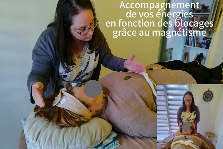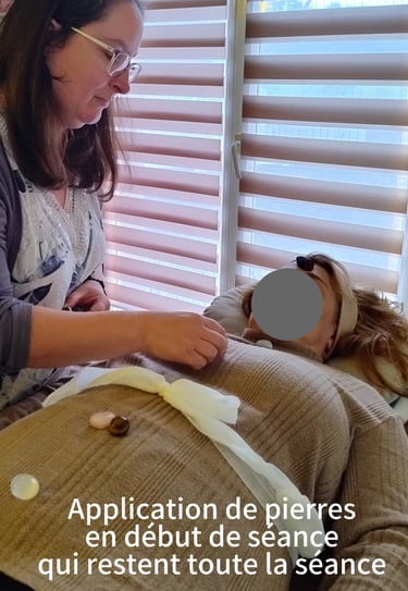 Au début et tout au long du soin, j'appose mes mains pour ressentir les zones des différents blocages. Je renforce l'action de certaines pierres avec mon magnétisme en fonction de ces blocages. Je réévalue régulièrement l'action de mes pierres. J'observe vos réactions physiques et les note par rapport au protocole en cours, cela me permet de comprendre l'action des pierres à ce moment-là (si réaction physique il y a). J'arrête la séance si une gêne, une sensation désagréable ou douloureuse apparaît. Il est important de m'en informer au cours de la séance.